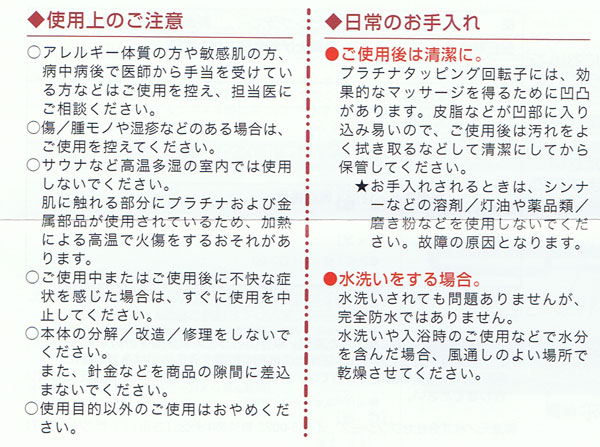 今回のリニューアルでは、構造的に肌への接触面積の拡大を求めるため、回転子の表面積を拡大してマイナスイオンの放出量を高めています。また、プラチナの円形ワイヤーとテフロン弾性体による緩衝効果で、皮膚の安全性を保守いたしました。電気を一切使用しないので、浴室でも使用ができるようになっています。